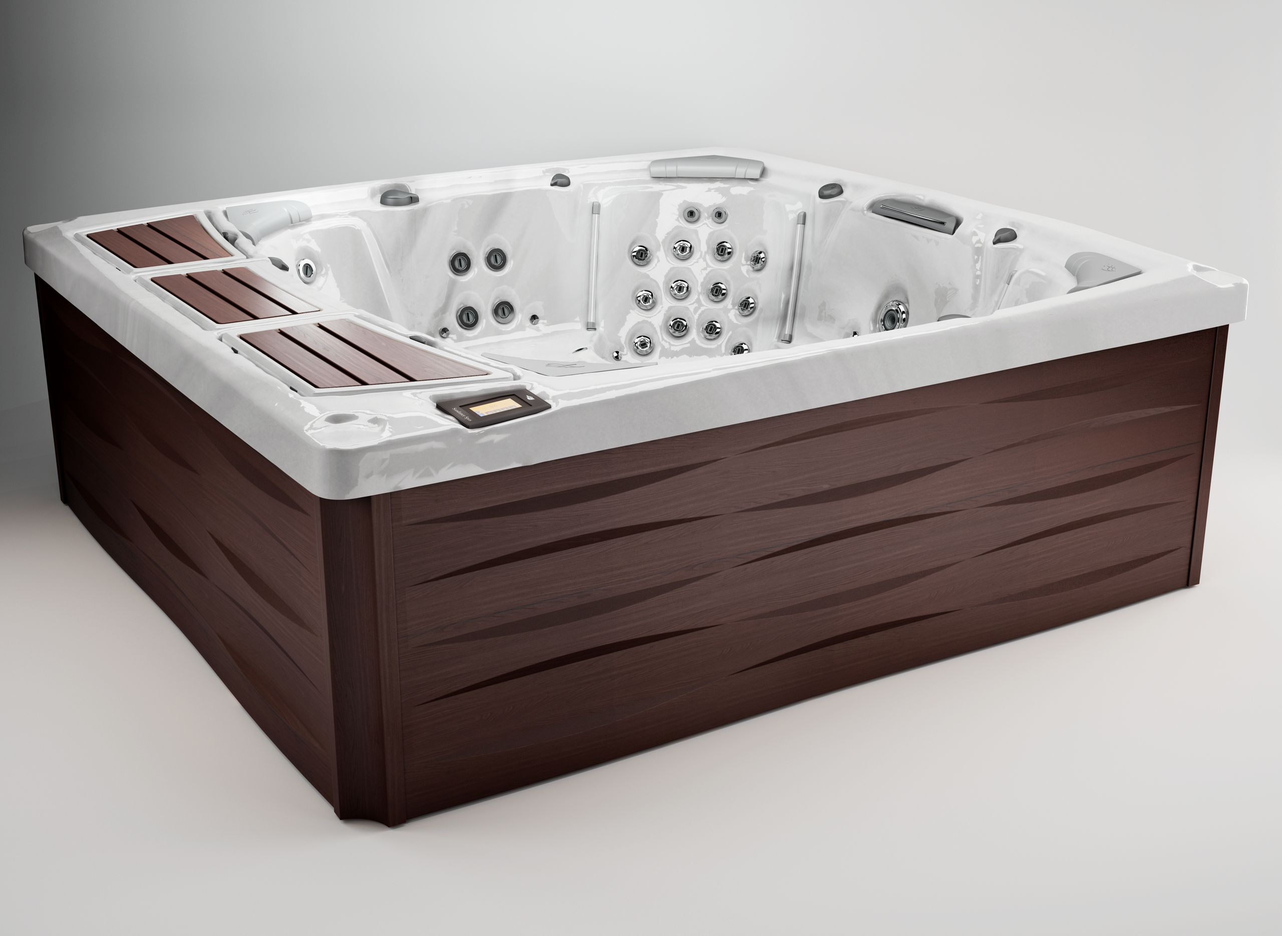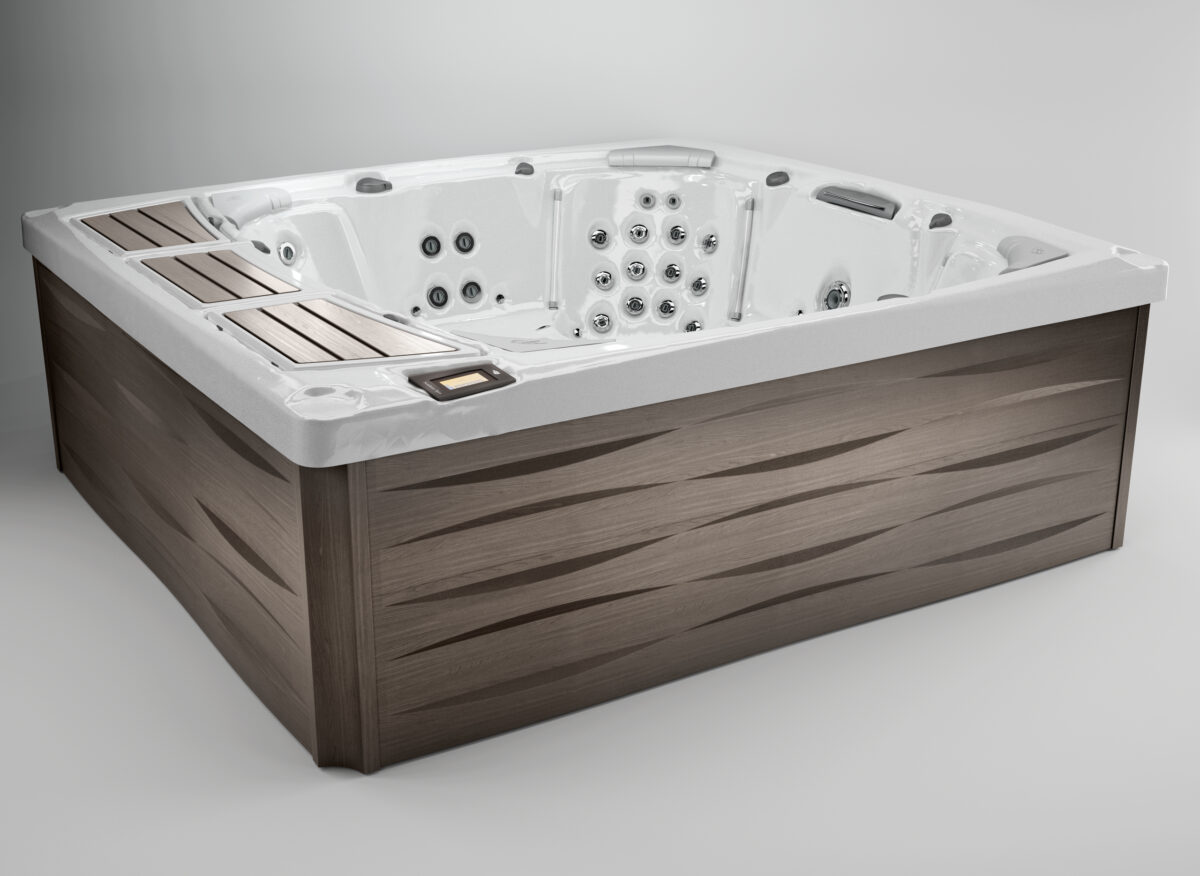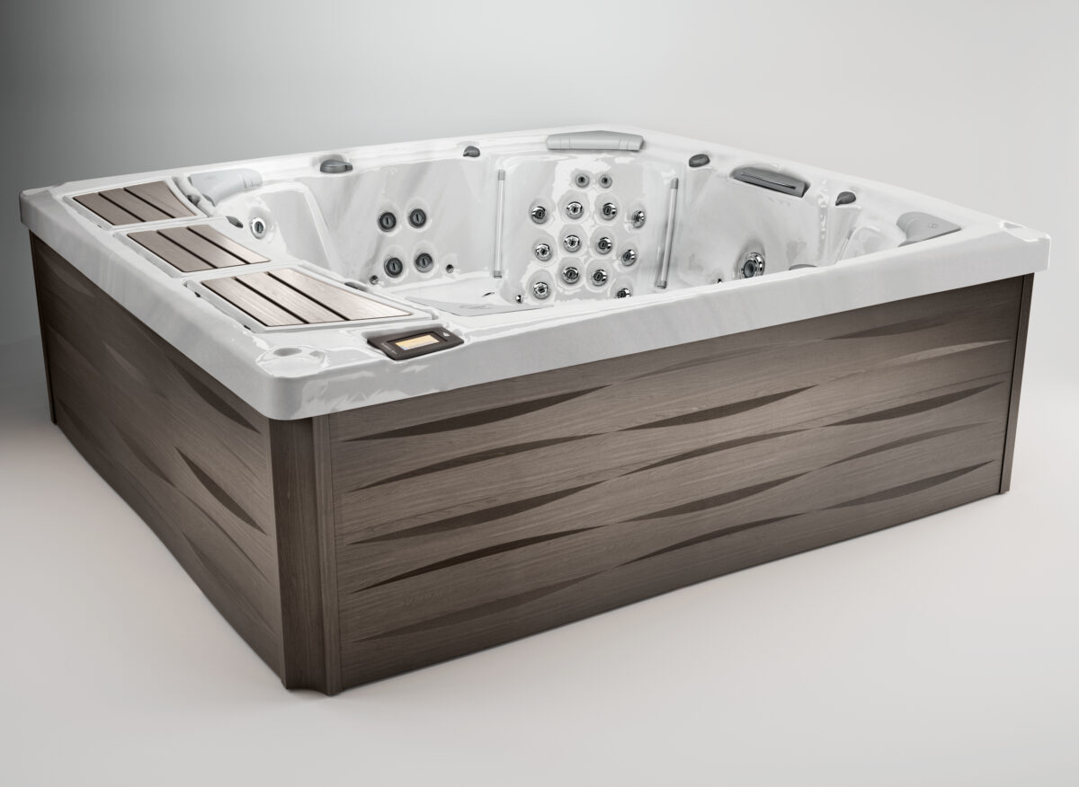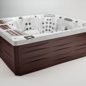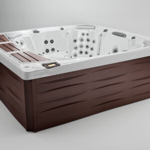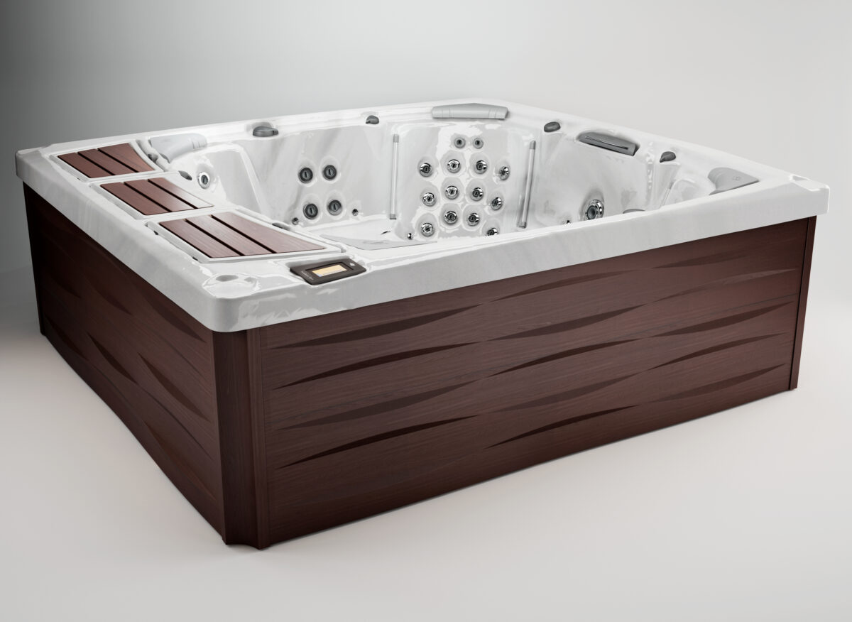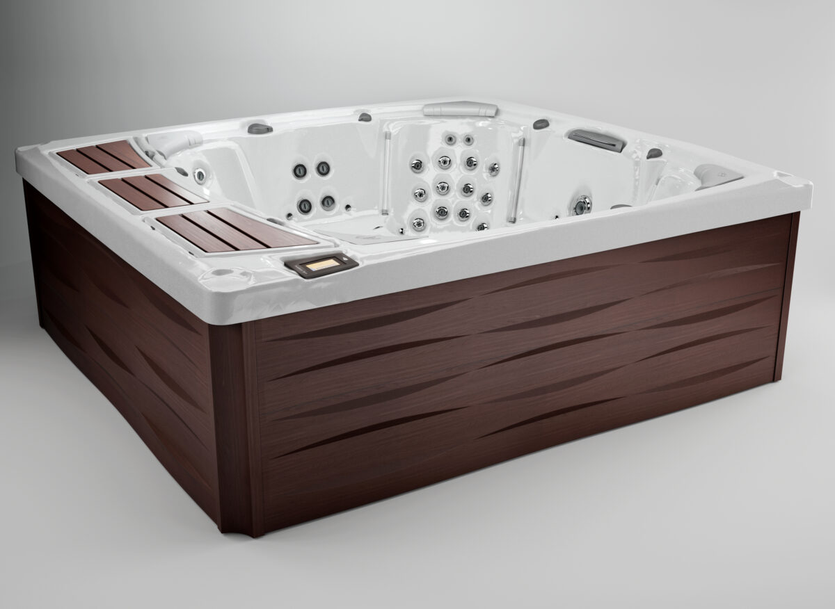This flagship 980™ model seats 6–7 and delivers a full sensory experience with up to 57 hydrotherapy jets plus air injectors. It features the architectural-geometric cabinetry, illuminated corner lighting, a wide flat top rail, and an integrated lounge deck with SunCooler™ cold storage. The Glass i-Touch touchscreen and SmartTub-ready control system make it as smart as it is luxurious.