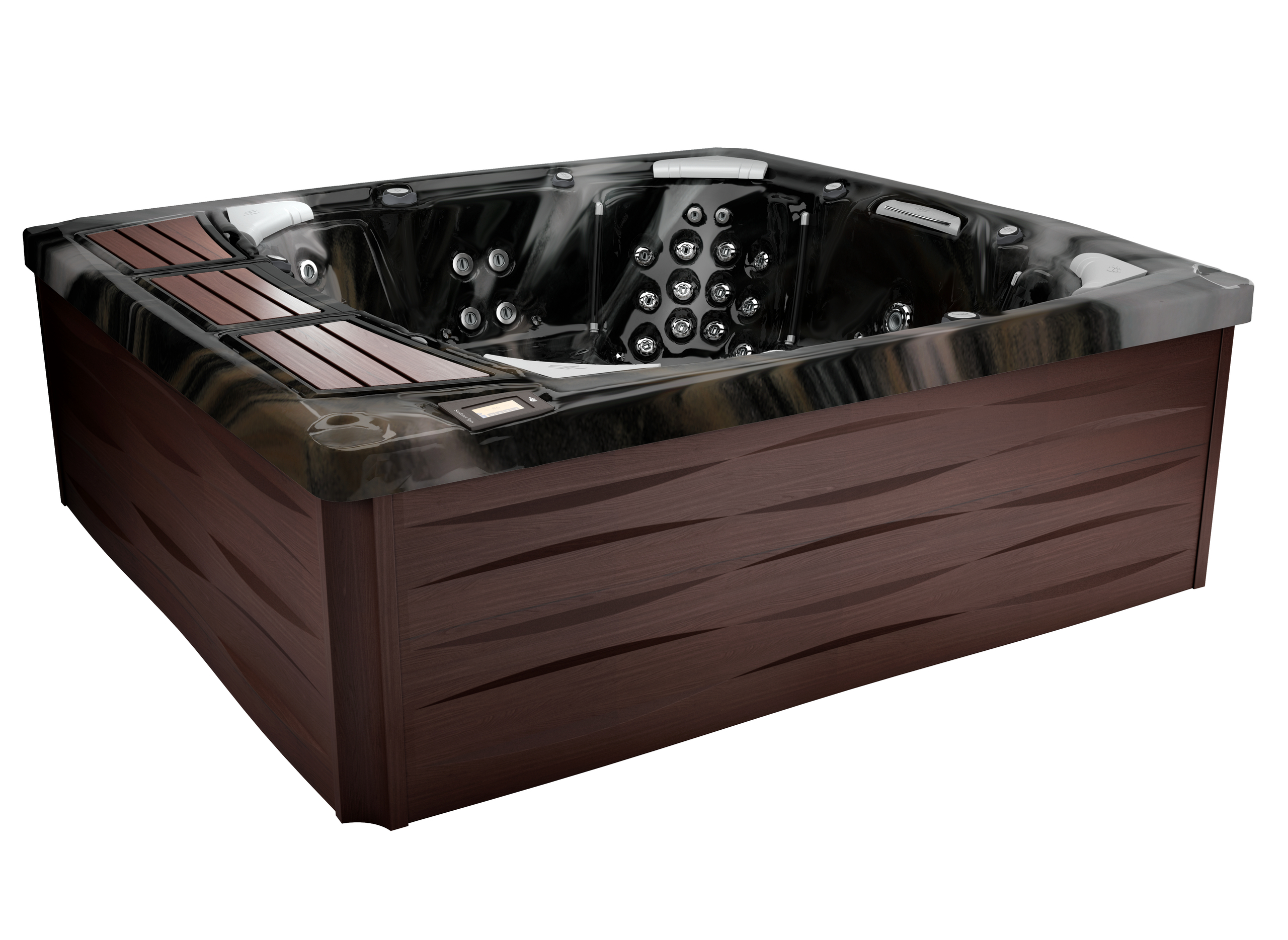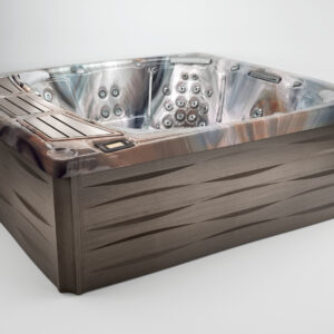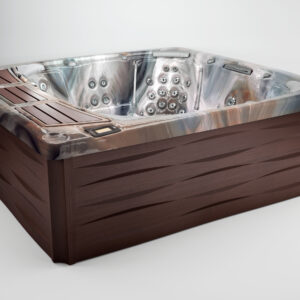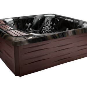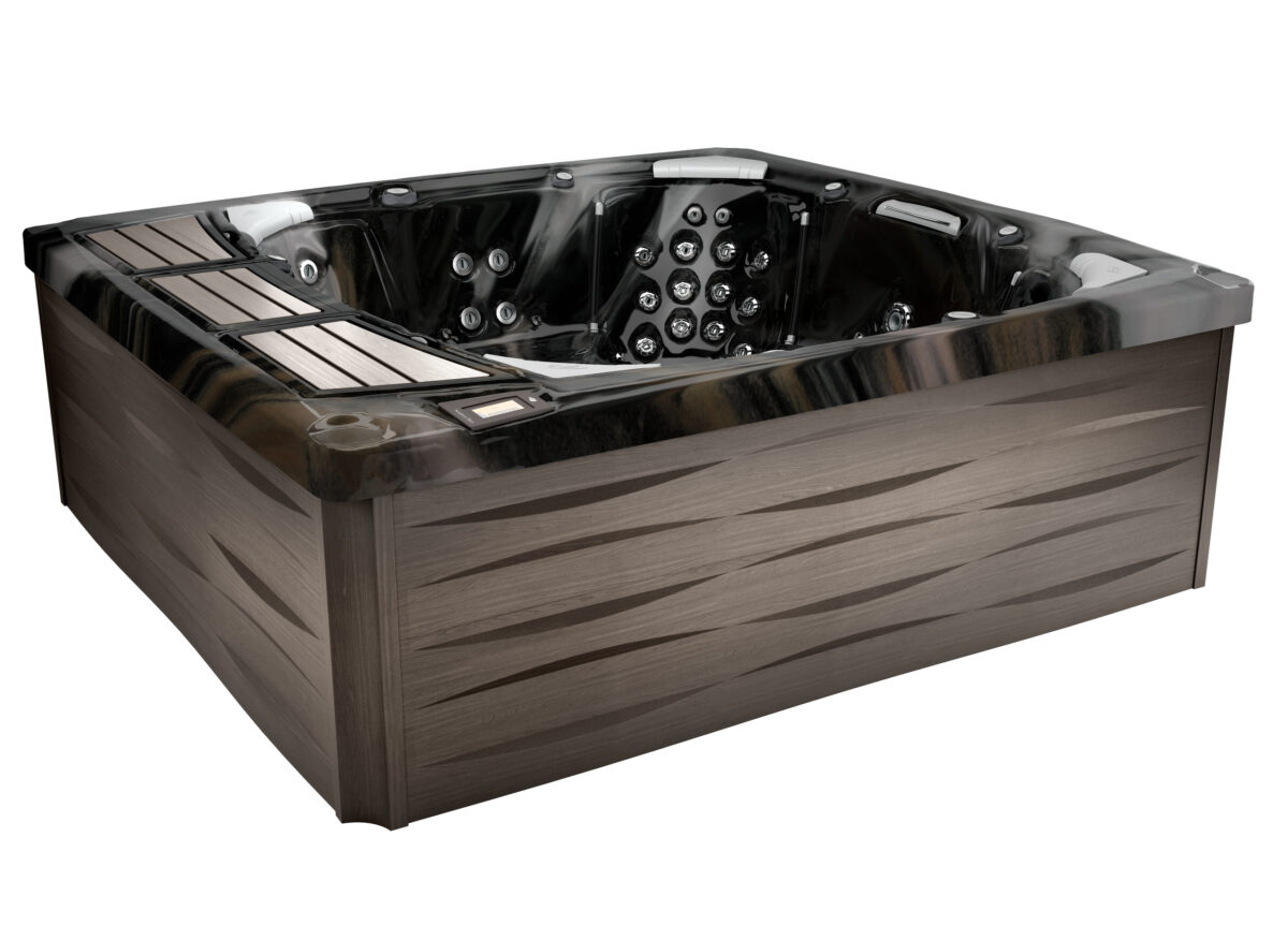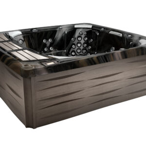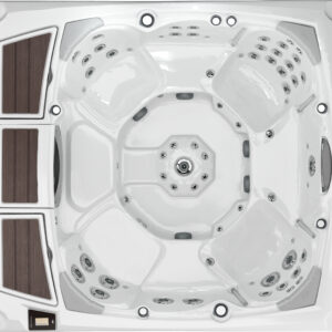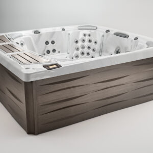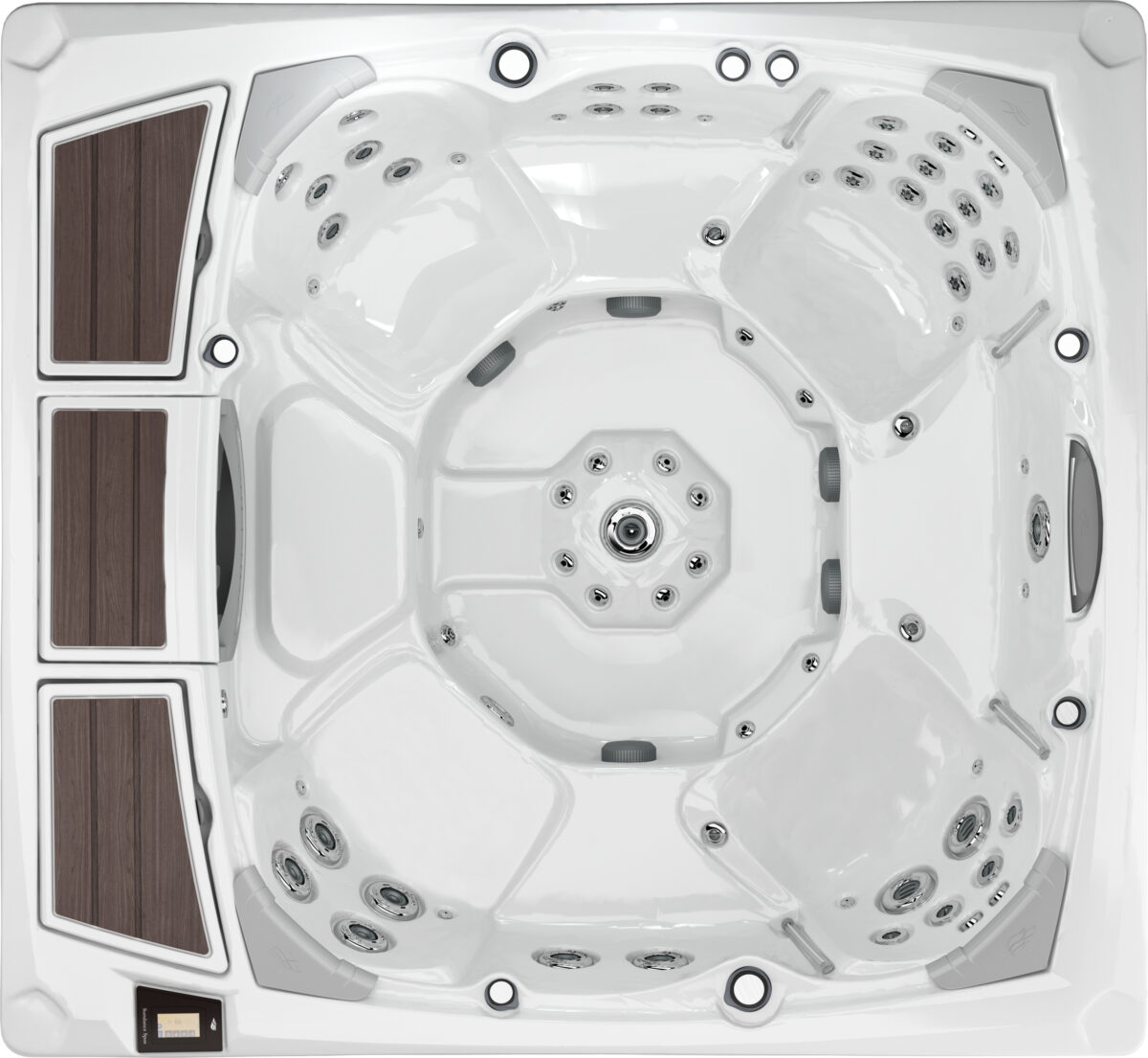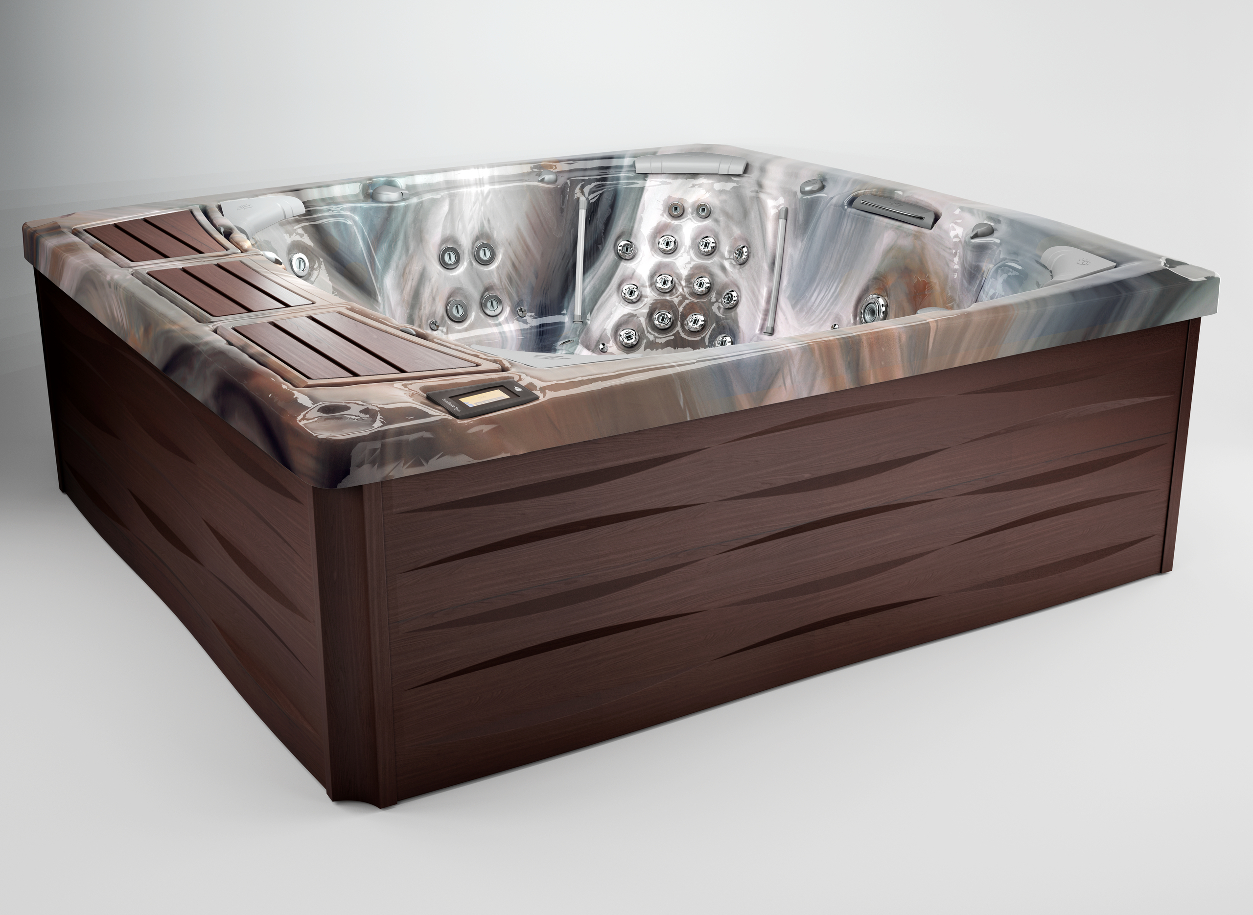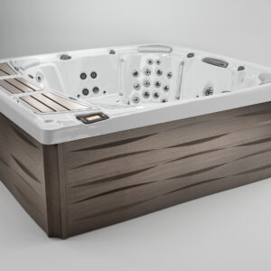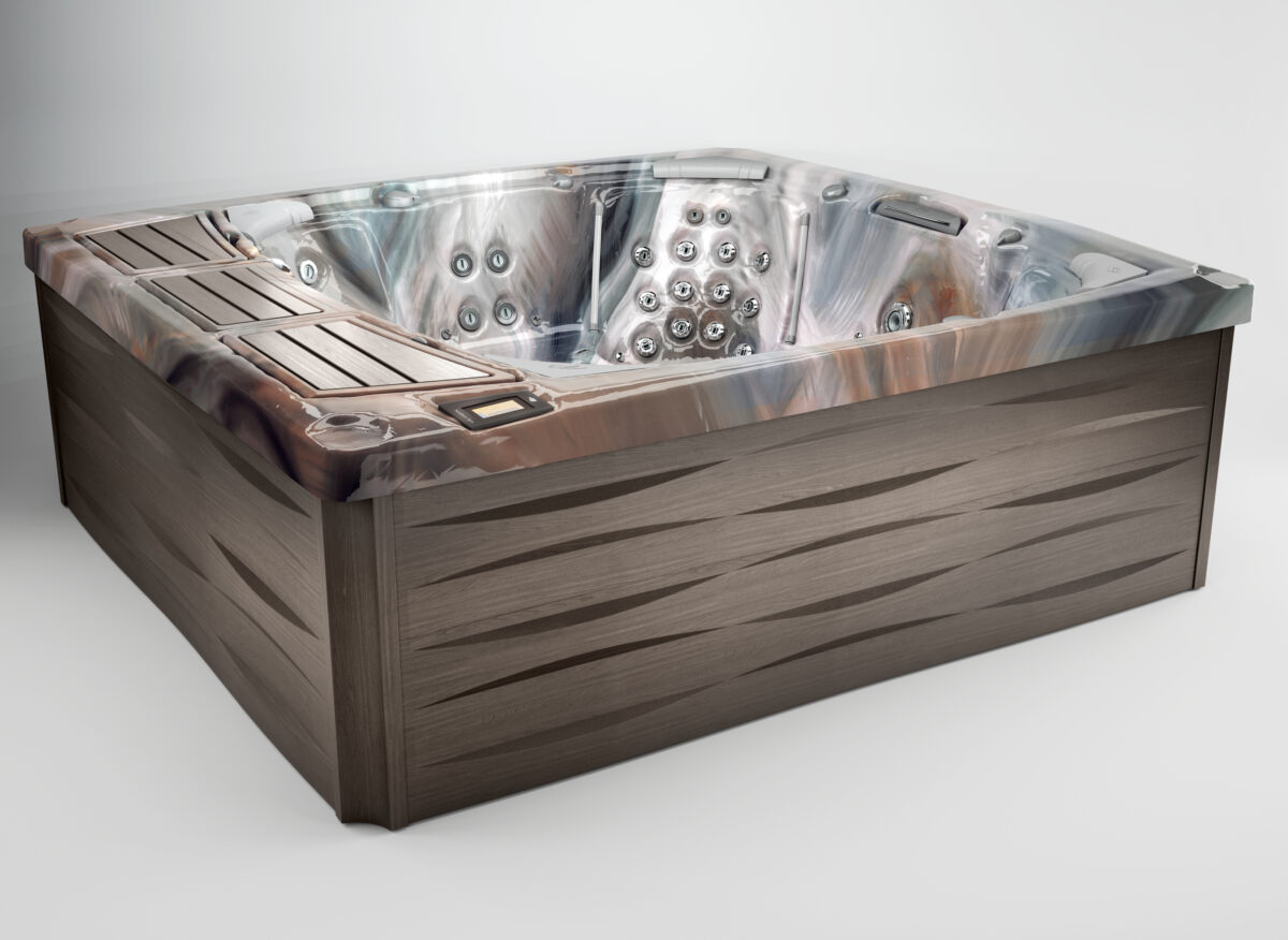 This flagship 980™ model seats 6–7 and delivers a full sensory experience with up to 57 hydrotherapy jets plus air injectors. It features the architectural-geometric cabinetry, illuminated corner lighting, a wide flat top rail, and an integrated lounge deck with SunCooler™ cold storage. The Glass i-Touch touchscreen and SmartTub-ready control system make it as smart as it is luxurious.