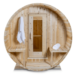 The Canadian Timber Serenity by Leisurecraft is a beautifully crafted outdoor barrel sauna built with Eastern White Cedar. Known for its light tone and durability, this cedar performs well in Wyomings changing climates and adds a rustic charm to backyard or cabin spaces.